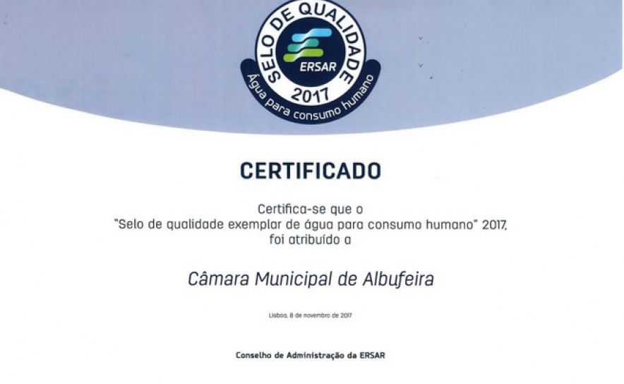 A Entidade Reguladora dos Serviços de Águas e Resíduos (ERSAR) voltou a atribuir à Câmara Municipal de Albufeira o “Selo de qualidade exemplar de água para consumo humano”, numa cerimónia que teve lugar no passado dia 8 de novembro, durante a 12.ª Expo Conferência da Água, em Lisboa.