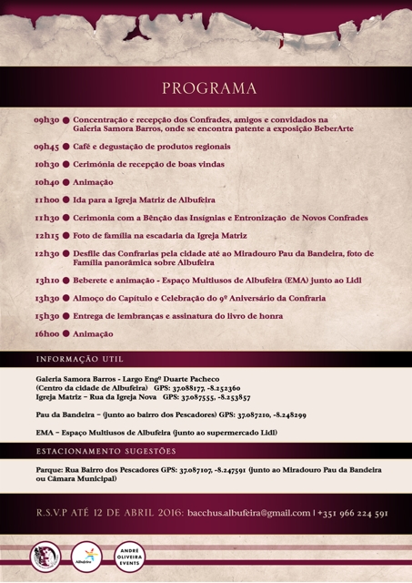 No decurso do almoço, marcado para as 13.30 horas, não faltarão motivos para celebrar: vão cantar-se os parabéns à Confraria pelo seu 9º aniversário e será também altura para a apresentação oficial do programa da 8ª Grande Mostra de Vinhos de Portugal, da responsabilidade da Confraria Bacchus, agendado para os dias 6,7,8 e 9 de Maio, em Albufeira.
