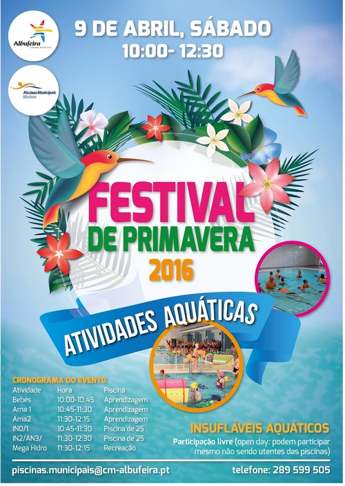 A iniciativa intitulada “Festival de Primavera 2016”, realiza-se no próximo dia 9 de abril (sábado), nas Piscinas Municipais de Albufeira, durante toda a manhã, das 10h00 às 12h30.