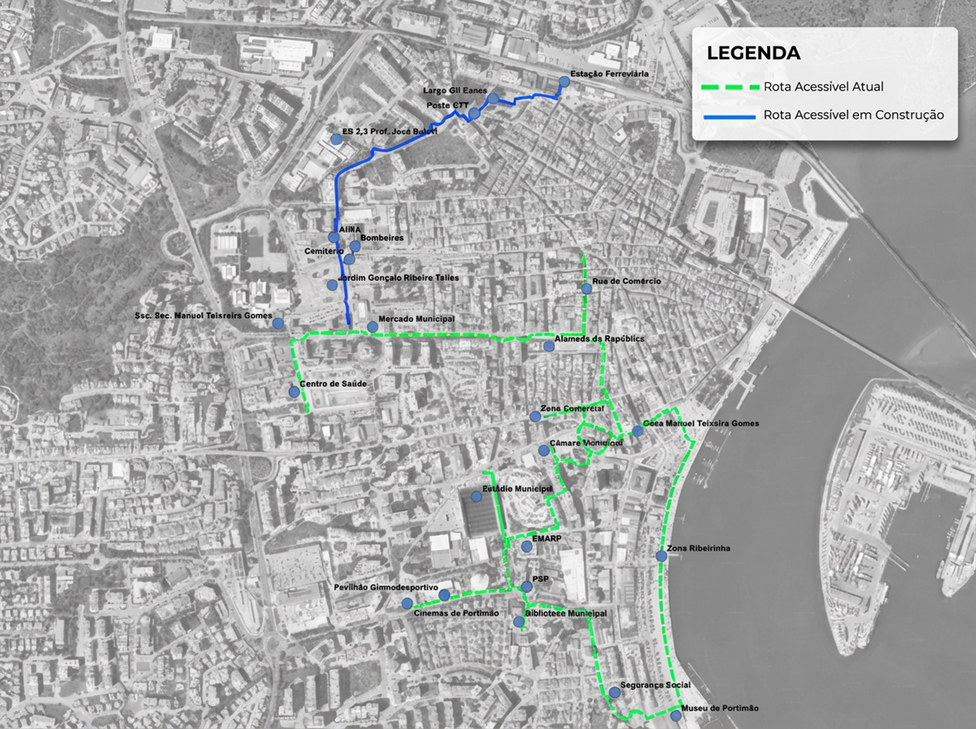 A intervenção incide sobre um troço da Rede Caminhável, assegurando uma ligação pedonal totalmente acessível entre o Quartel dos Bombeiros e a Estação Ferroviária de Portimão. Este percurso serve várias zonas com elevada utilização pedonal, nomeadamente o Cemitério Municipal, a AIMA, o Posto dos CTT do Largo Gil Eanes e o Jardim do Largo Gil Eanes, incluindo o respetivo campo de jogos.