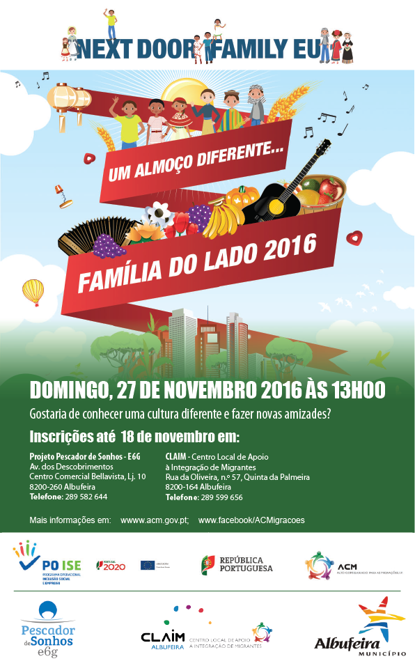 O Município de Albufeira participa na 5ª edição do projeto “Família do Lado”, uma iniciativa que no próximo dia 27 de novembro, pelas 13h00, vai sentar à mesma mesa famílias que não se conhecem - uma família imigrante ou refugida e outra autóctone, à volta de um almoço-convívio, típico da cultura da família anfitriã. O objetivo passa por promover uma melhor integração dos imigrantes na comunidade, reforçando as relações sociais e promovendo a diversidade cultural.