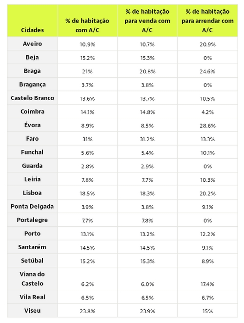 Faro é a cidade que apresenta mais casas com A/C anunciadas para venda e arrendamento (31%), seguindo-se na lista Viseu (23,8%), Braga (21%), Lisboa (18,5%) e Setúbal (15,2%), por esta ordem. No Porto só 13,1% dos imóveis anunciados para venda e arrendamento têm A/C, menos que a média nacional (13,9%).