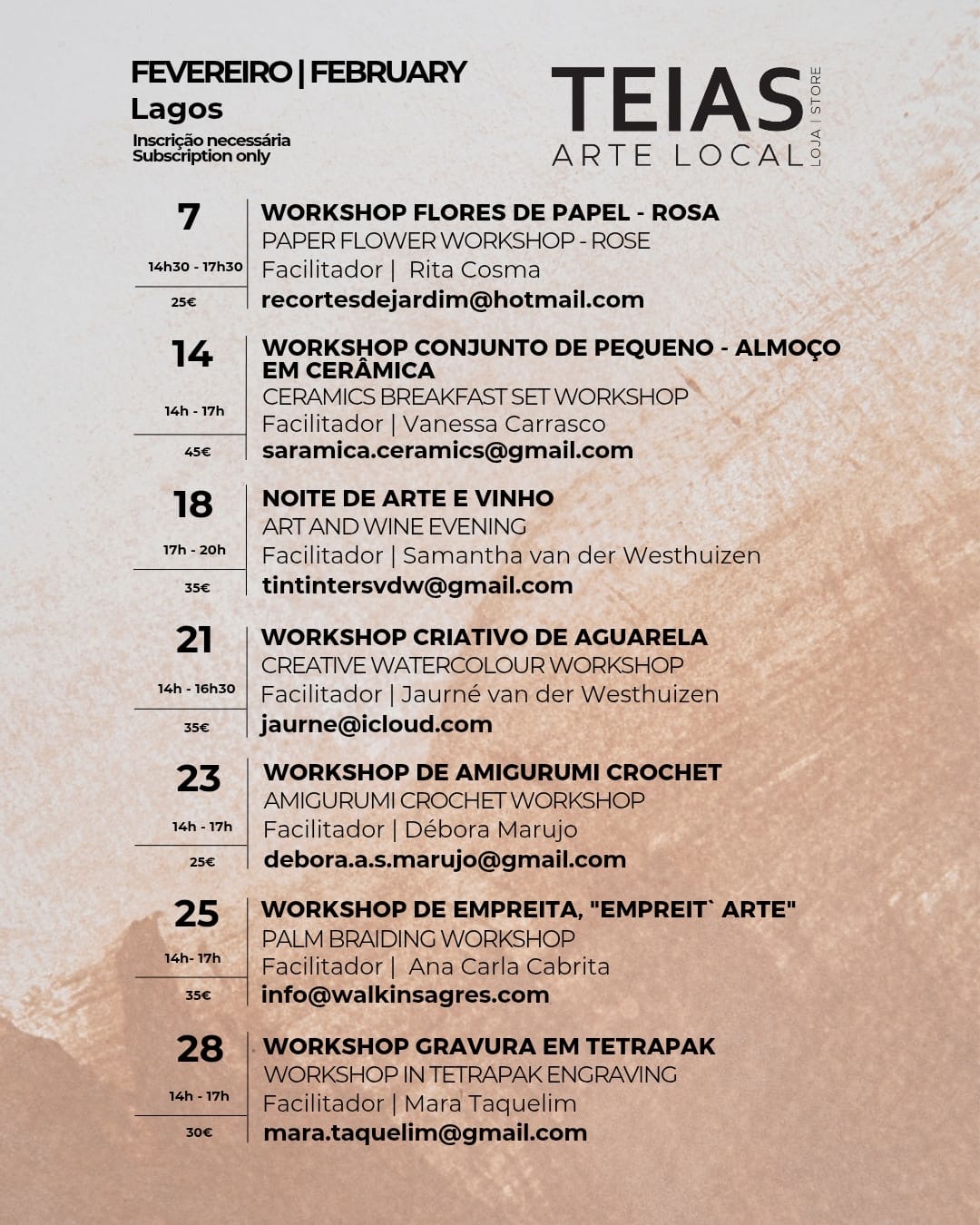 Explore rosas de papel, cerâmica, técnicas japonesas de crochet, trançado tradicional de palma algarvio, impressão em Tetra Pak, aguarela e acrílico, numa experiência imersiva e inspiradora para quem tem curiosidade em experimentar, abrandar e criar algo único.