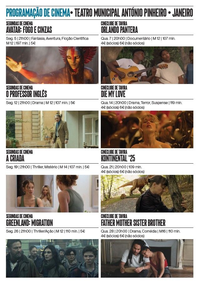 A agenda integra as propostas do Cineclube de Tavira, o ciclo Segundas de Cinema, mantendo, deste modo, o compromisso com uma programação cultural diversificada e acessível. Os bilhetes têm o valor de €4,00 (sócios) e €6,00 (não sócios) nas sessões do Cineclube, sendo €5,00 para as Segundas de Cinema e Cinema em Família.