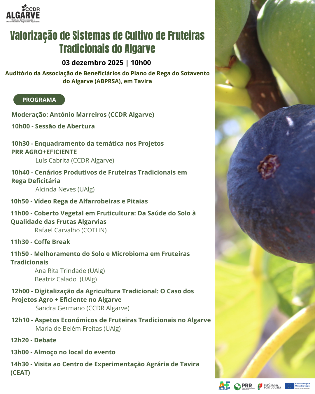 - 10h30 – Enquadramento da temática nos Projetos PRR AGRO+EFICIENTE (Luís Cabrita, CCDR Algarve)