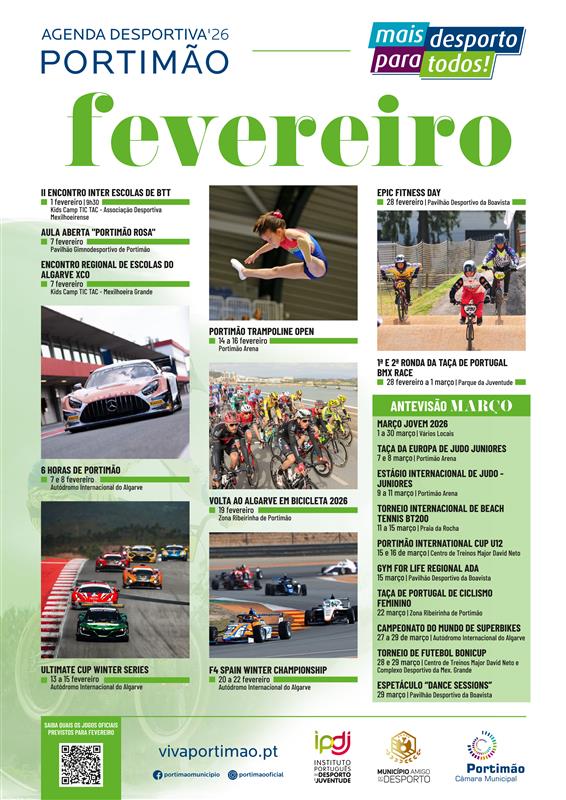 A agenda mensal de fevereiro, onde constam todas as competições, está disponível para consulta nas redes sociais do Município de Portimão e no seguinte endereço: http://vivaportimao.pt