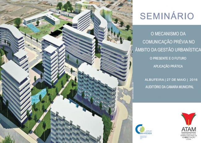 A Associação dos Técnicos Administrativos Municipais, ATAM, realiza no próximo dia 27/5, às 9,30h, um Seminário, subordinado ao tema A COMUNICAÇÃO PRÉVIA NO ÂMBITO DA GESTÃO URBANÍSTICA, em que participarão técnicos projetistas, autarcas, construtores civis, mediadores imobiliários, etc.