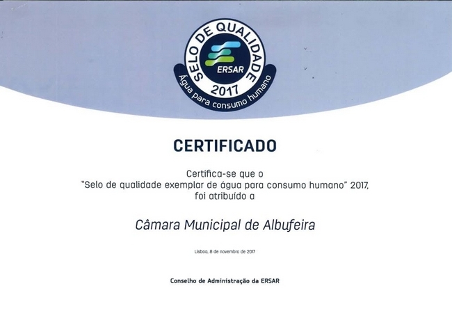 A Câmara Municipal de Albufeira foi distinguida pela Entidade Reguladora dos Serviços de Água e Resíduos (ERSAR) com o «Selo de qualidade exemplar da água para consumo humano», referente à qualidade da água fornecida em 2016. Esta é a segunda vez que o Município recebe este galardão, que visa premiar a excelência da água que chega à torneira dos consumidores.