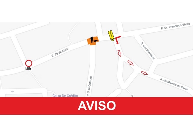 Os veículos que circulem na Rua Dr. Francisco Vieira serão desviados para a Rua do Moinho da Porta.