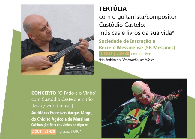 No dia 2 outubro, Custódio Castelo dará um concerto, pelas 21h30, no Auditório Francisco Vargas Mogo, do Crédito Agrícola de Messines. Este evento, intitulado “O Fado e o Vinho”, terá uma componente de fado, mas também de world music e conta com a colaboração da Rota dos Vinhos do Algarve. Os ingressos poderão ser adquiridos a partir de 20 de setembro na Junta de Freguesia de SB Messines, na Sociedade de Instrução e Recreio Messinense, na Crédito Agrícola de SB Messines e no Museu Municipal de Arqueologia, em Silves. Terão um custo associado de 5,00 euros e incluirão um welcome drink e um copo de vinho por pessoa no final do concerto, que os participantes poderão desfrutar na companhia do músico e que será servido pela Rota dos Vinhos do Algarve.