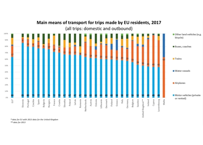 Em 2017, os residentes em Portugal fizeram 17.474 viagens de lazer, ou de negócios, com uma duração média de quatro noites. A maioria (89%) escolheu viajar por terra, quase sempre de carro (79,9%). Também houve quem escolhesse comboio, 3,3%, ou autocarro, 4,6%. Só uma minoria viajou de avião (10,5%) e muito poucos viajaram de barco (0,5%).