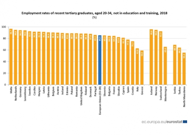 A taxa de emprego dos recém-licenciados em Portugal com idades entre os 20 e os 34 anos foi de 85,9% em 2018, situando-se acima da média registada na União Europeia (UE), que foi de 85,5%.