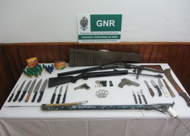 Após diligências investigatórias, os militares realizaram no dia de ontem as referidas buscas, das quais resultou a apreensão do seguinte armamento: uma espingarda caçadeira (calibre 12); uma pistola de calibre 6,35mm; duas réplicas de arma de fogo; uma espingarda de ar comprimido; uma pistola de pesca submarina; uma catana; diversas armas brancas (facas); uma soqueira e cinquenta (50) cartuchos calibre 12.