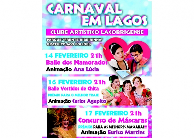 Em alguns locais do concelho, e para muitos munícipes, o Carnaval continua a ser vivido e comemorado ao jeito de outros tempos. Manteve-se o gosto e o interesse pelas máscaras e pela animação dos Bailes de Carnaval, que algumas coletividades e instituições do concelho procuram não deixar desaparecer. Este ano, o renovado Clube Artístico Lacobrigense, reabre portas e, em parceria com o Centro de Cultura e Desporto dos Trabalhadores da Câmara Municipal de Lagos (CCDT-CML), organizou um programa com muita animação (e três grandes Bailes de Máscaras, cada um subordinado a um tema), que se inicia a 14, com o Dia dos Namorados, e termina no dia do Entrudo, todos a partir das 21h00. De referir que o parque de estacionamento da Frente Ribeirinha será gratuito para os foliões, mediante a apresentação do ticket validado no local. Em Odiáxere, a tradicional festa e desfile irá decorrer no dia 17, a partir das 15h00, junto ao Moinho. No Chinicato, a Festa também promete, com dois Bailes e o já conhecido Enterro do Entrudo! Participe!
