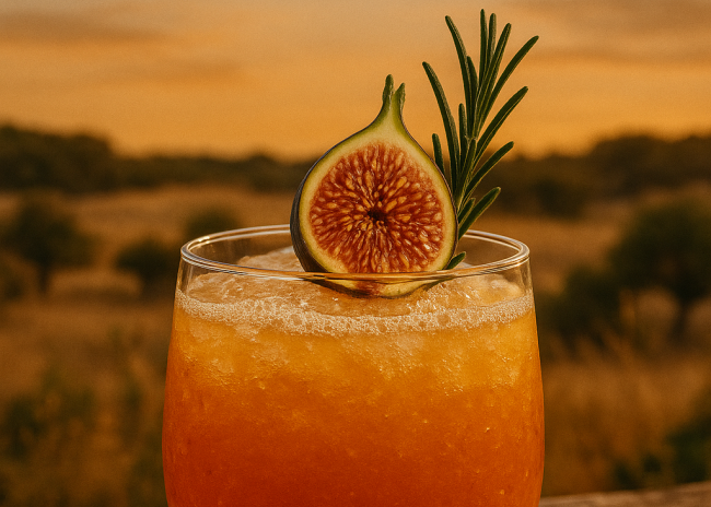 Por fim, o “Figo & Fogo” celebra a alma quente do Algarve. Inspirado no aroma dos figos maduros ao sol, este cocktail combina 50 ml de gin algarvio, um figo fresco esmagado, 15 ml de mel de rosmaninho, 15 ml de sumo de limão e um toque opcional de aguardente de medronho para maior intensidade. Num shaker, os ingredientes são agitados vigorosamente durante 15 a 20 segundos até arrefecer e emulsionar, antes de serem coados para um copo on-the-rocks com gelo fresco. A decoração inclui meio figo e dois raminhos de alecrim — um deles levemente batido para libertar os óleos essenciais — criando um cocktail que é puro carácter: o sabor da terra, o calor do sul e a memória das tabernas antigas em cada gole.