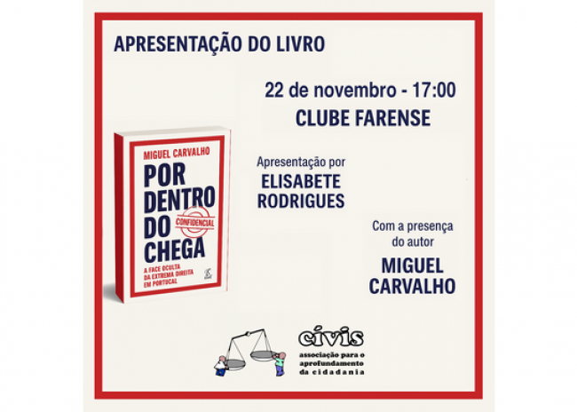 No próximo dia 22 de novembro, às 17:00, no Club Farense, a Cívis promove a apresentação do livro “Por dentro do Chega, a face oculta de extrema direita em Portugal” da autoria de Miguel Carvalho, (Objetiva, 2025).