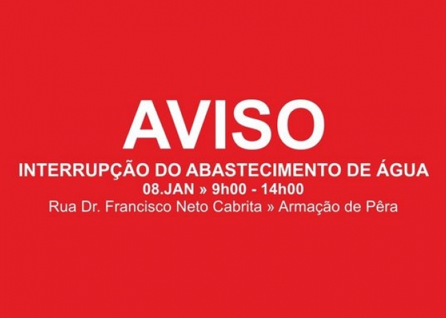 INTERRUPÇÃO TEMPORÁRIA DO ABASTECIMENTO DE ÁGUA NA RUA DR. FRANCISCO NETO CABRITA, ARMAÇÃO DE PÊRA, NO DIA 8 DE JANEIRO