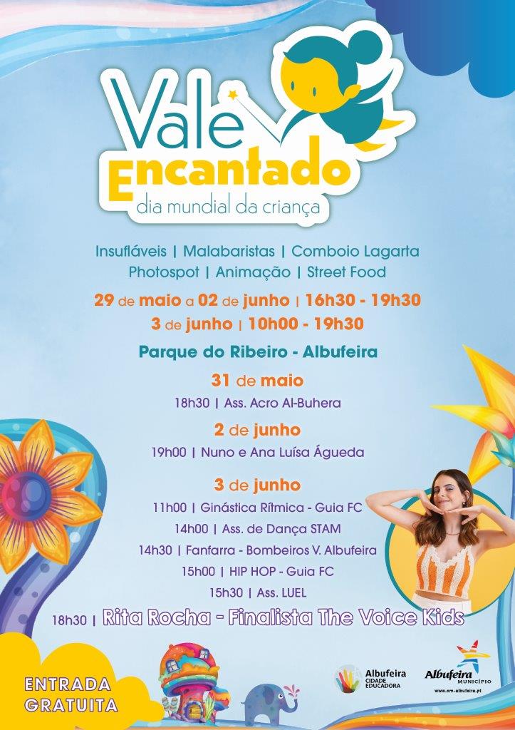 O Vale Encantado volta a acolher as celebrações do Dia Mundial da Criança em Albufeira. O programa decorre no Parque do Ribeiro, junto à Rotunda dos Descobrimentos e a uma das entradas principais da cidade, com várias atividades especialmente pensadas para os mais pequeninos, de 29 de maio a 2 de junho, das 16h30 às 19h30 e no dia 3 de maio, a partir das 10h00 até às 19h30.