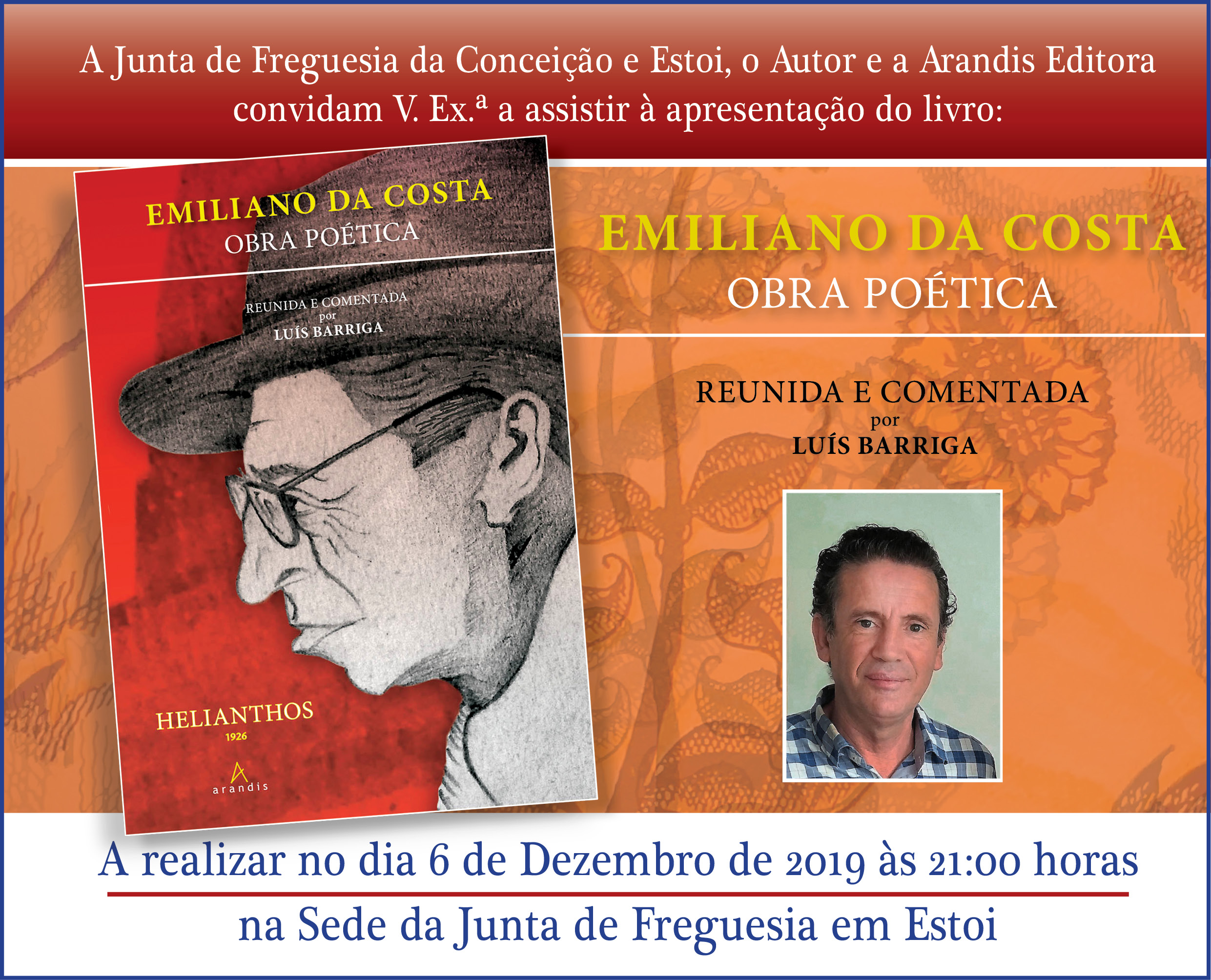 será apresentado o primeiro volume de uma coleção completa da Obra Poética de Emiliano da Costa, comemorando os 135 anos do seu nascimento, 03 de dezembro de 1884. A coleção agora iniciada tem por título «EMILIANO DA COSTA – OBRA POÉTICA» e é reunida e comentada por Luís Barriga. Este primeiro volume tem o apoio à edição da União de Freguesias de Conceição e Estoi e da Câmara Municipal de Tavira.