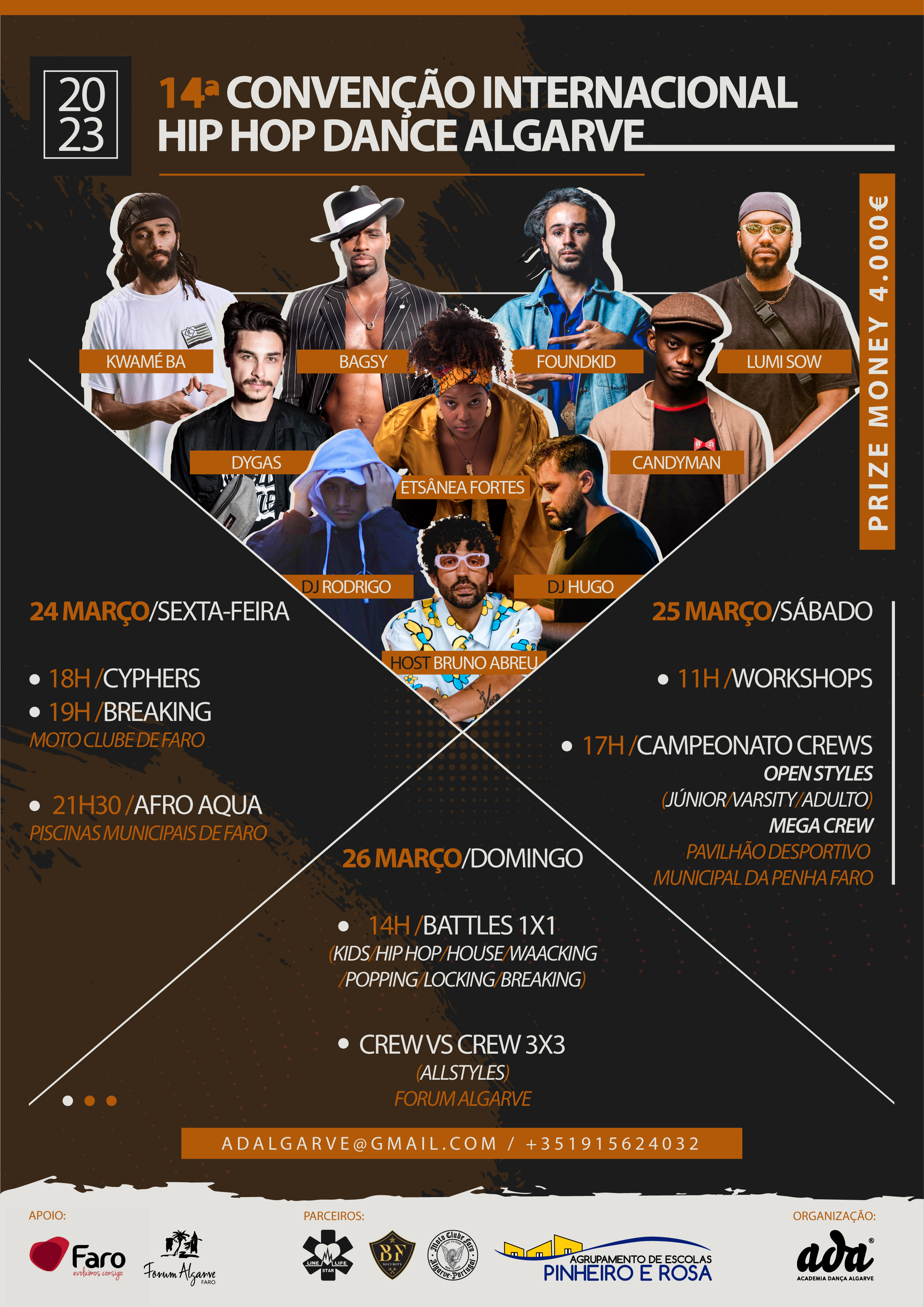 Já na sua 14a edição, o “Hip Hop Dance Algarve”, o maior campeonato de danças urbanas do Algarve, organizado pela Academia de Dança do Algarve e realiza-se nos próximos dias 24, 25 e 26 de Março, na pitoresca cidade de Faro.
