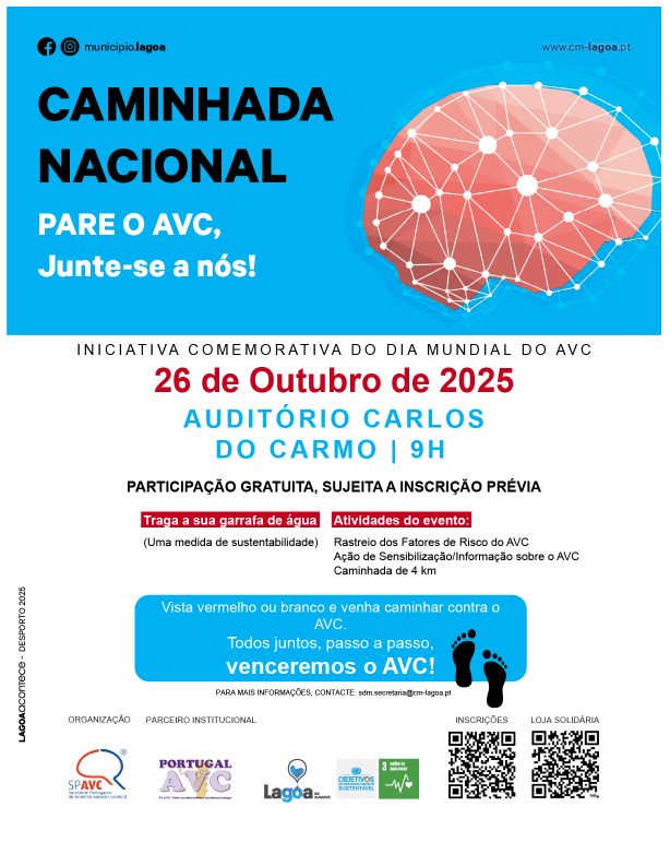 Com o intuito de sensibilizar para uma das principais causas de morte e também de incapacidade física e mental, o Município de Lagoa junta-se à Sociedade Portuguesa do Acidente Vascular Cerebral para assinalar o Dia Mundial do AVC através da campanha Pare o AVC, junte-se a nós.