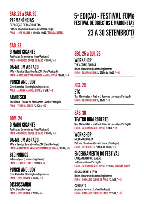 O mote da programação para este ano é o CONVÍVIO. São 5 anos de FOMe. 10 companhias, dez espectáculos, uma exposição, dois workshops, um concerto e DJ – todos reunidos à volta das marionetas. Artistas nacionais e internacionais vão cruzar-se com público estrangeiro e português através de espectáculos reveladores das tradições dos seus países, num convívio de culturas.