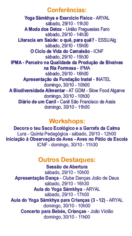Yoga H.H. Sat Guru Amrta Súryánanda Mahá Rája, de várias personalidades da região e uma agenda com diferentes temas e abordagens integradas num ciclo de conferências, bem como a realização de práticas do Yoga Sámkhya, para adultos e crianças, e, complementarmente, a criação de uma vasta área de exposição, onde as entidades presentes terão oportunidade de apresentar aos visitantes os aspetos mais relevantes das suas atividades.