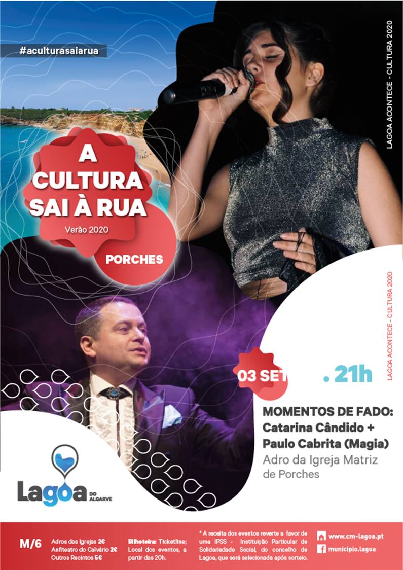 Será pelas 21h que o Adro da Igreja Matriz, em Porches, recebes o espetáculo de música e magia “Momentos de Fado: Catarina Cândido + Paulo Cabrita (Magia)” que irá proporcionar um concerto de Fado, pela voz de Catarina Cândido com momentos de Magia proporcionados pelo mágico Paulo Cabrita.