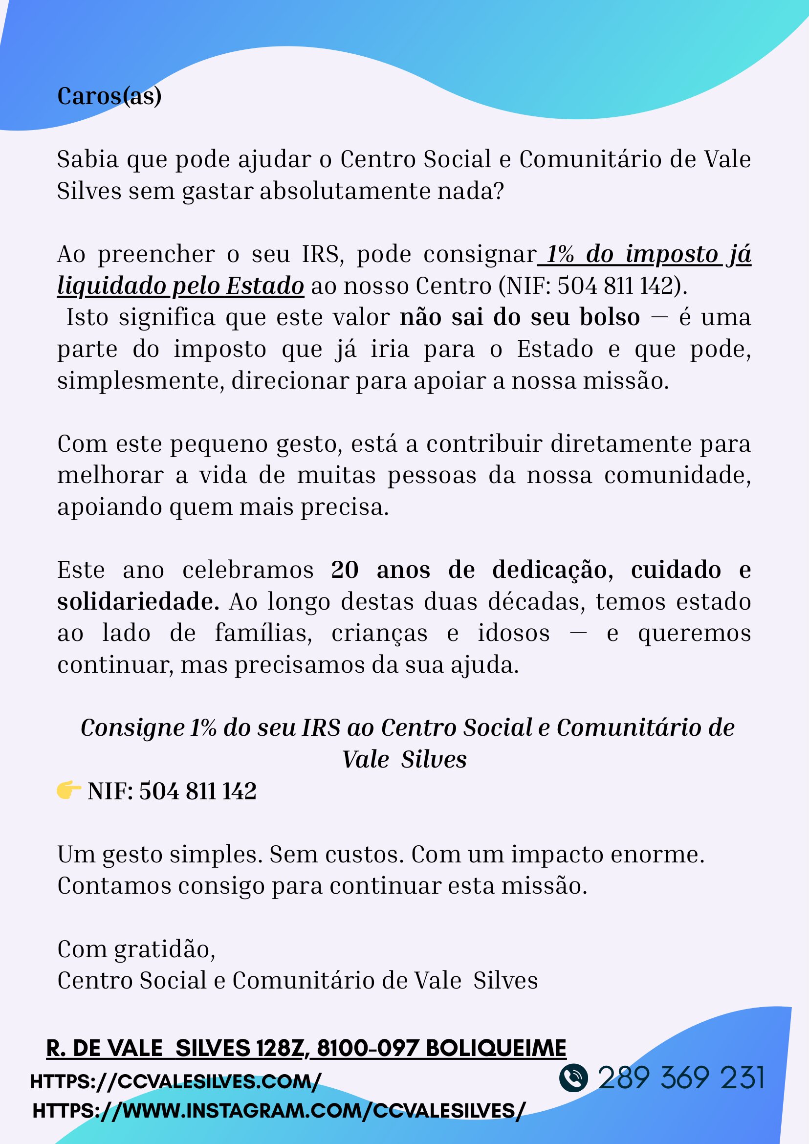 Celebramos este ano 20 anos a apoiar famílias, crianças e idosos, e contamos consigo para continuar este caminho.