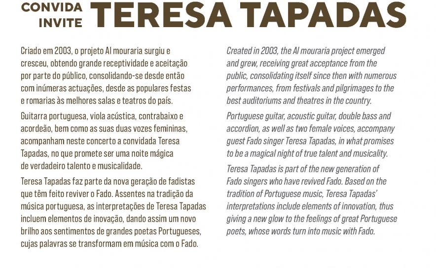 Criado em 2003, o projeto Al-Mouraria surgiu e cresceu, obtendo grande receptividade e aceitação por parte do público, consolidando-se desde então com inúmeras actuações, desde as populares festas e romarias às melhores salas e teatros do país. Guitarra portuguesa, viola acústica, contrabaixo e acordeão, bem como as suas duas vozes femininas, acompanham neste concerto a convidada Teresa Tapadas, no que promete ser uma noite mágica de verdadeiro talento e