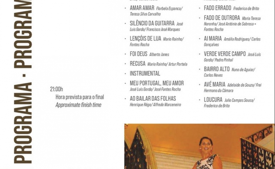 O concerto apresentará um repertório de excelência, ao longo de 75 minutos, onde se cantarão grandes temas do fado, como «Amar Amar» de Florbela Espanca e Teresa Silva Carvalho, «Ai Maria» de Amália Rodrigues e Carlos Gonçalves, «Na Boca de Toda a Gente» de Tiago Torres da Silva e Daniel Gouveia, entre muitos outros.