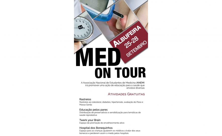 A Associação Nacional de Estudantes de Medicina (ANEM) vai estar em Albufeira de 25 a 28 de setembro para realizar uma ação de educação para a saúde “Med On Tur”. Fique atento ao programa e traga a família e amigos! Juntos, vamos prevenir a doença e promover a saúde da população de Albufeira! A participação é gratuita.