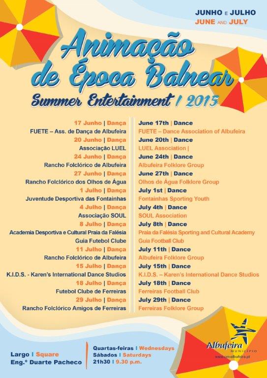 Até ao final do mês de junho vão realizar-se os seguintes espetáculos: dia 20 (sábado) – Associação LUEL (Dança), dia 24 (quarta) – Rancho Folclórico de Albufeira (Folclore), 27 (sábado) – Rancho Folclórico de Olhos de Água (Folclore). Em julho a dança continua a estar em destaque com as atuações da Juventude Desportiva das Fontainhas, Associação SOUL, Academia Desportiva e Cultural da Praia da Falésia, Guia Futebol Clube, Rancho Folclórico de Albufeira, K.I.D.S – Karen´s International Dance Studios, Futebol Clube de Ferreiras e Rancho Folclórico Amigos de Ferreiras.