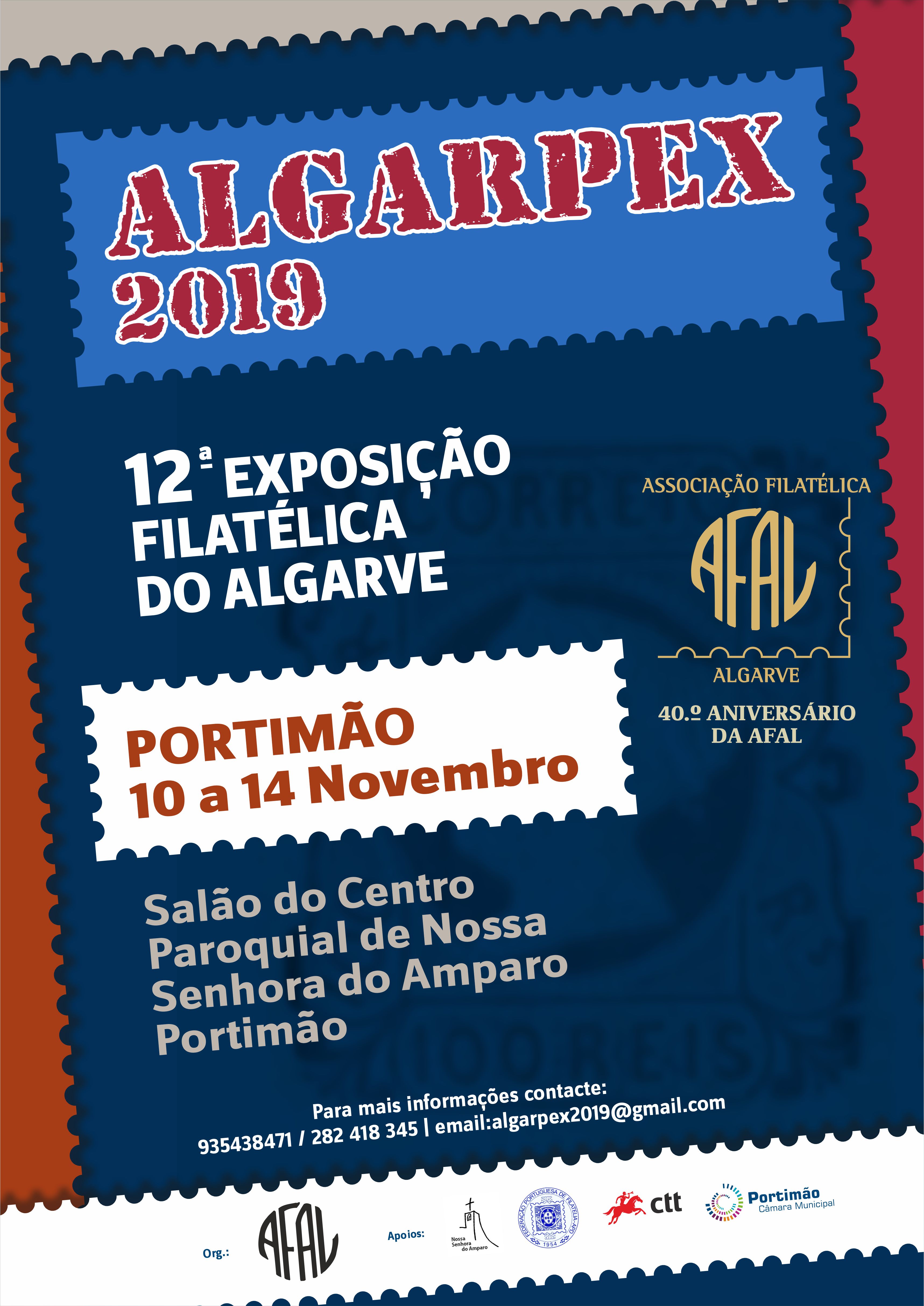 Após um ano de interregno, Portimão volta a receber a ALGARPEX – Exposição Filatélica do Algarve, cuja 12ª edição terá lugar no salão do Centro Paroquial da Nª Sr.ª do Amparo entre 10 e 14 de novembro, numa organização da AFAL - Associação Filatélica do Algarve com a colaboração da Secção Filatélica do Lions Clube local.