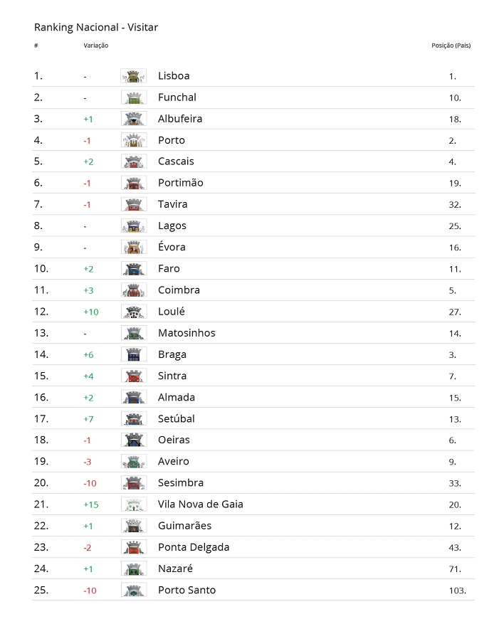 Destaque para as subidas de Loulé, devido à taxa de ocupação hoteleira, e Vila Nova de Gaia, devido ao aumento de dormidas que, com 10 e 15 posições respetivamente, ocupam lugares no Top 25 da categoria Visitar.