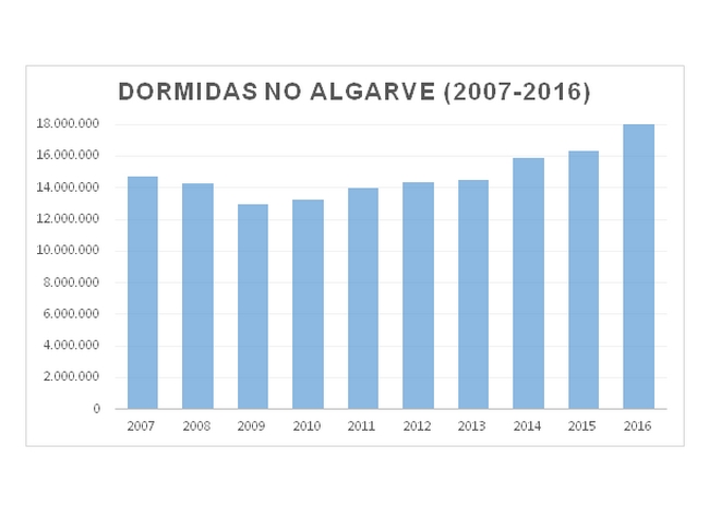 Em todo o ano de 2016 o valor acumulado das dormidas em estabelecimentos hoteleiros, aldeamentos e apartamentos turísticos no Algarve alcançou a fasquia dos 18,1 milhões, mais 9,0 por cento do que no ano anterior. Os mercados externos emissores de turistas para a região, liderados pelo Reino Unido, originaram 14,2 milhões de dormidas, mais 11,9 por cento do que em 2015.