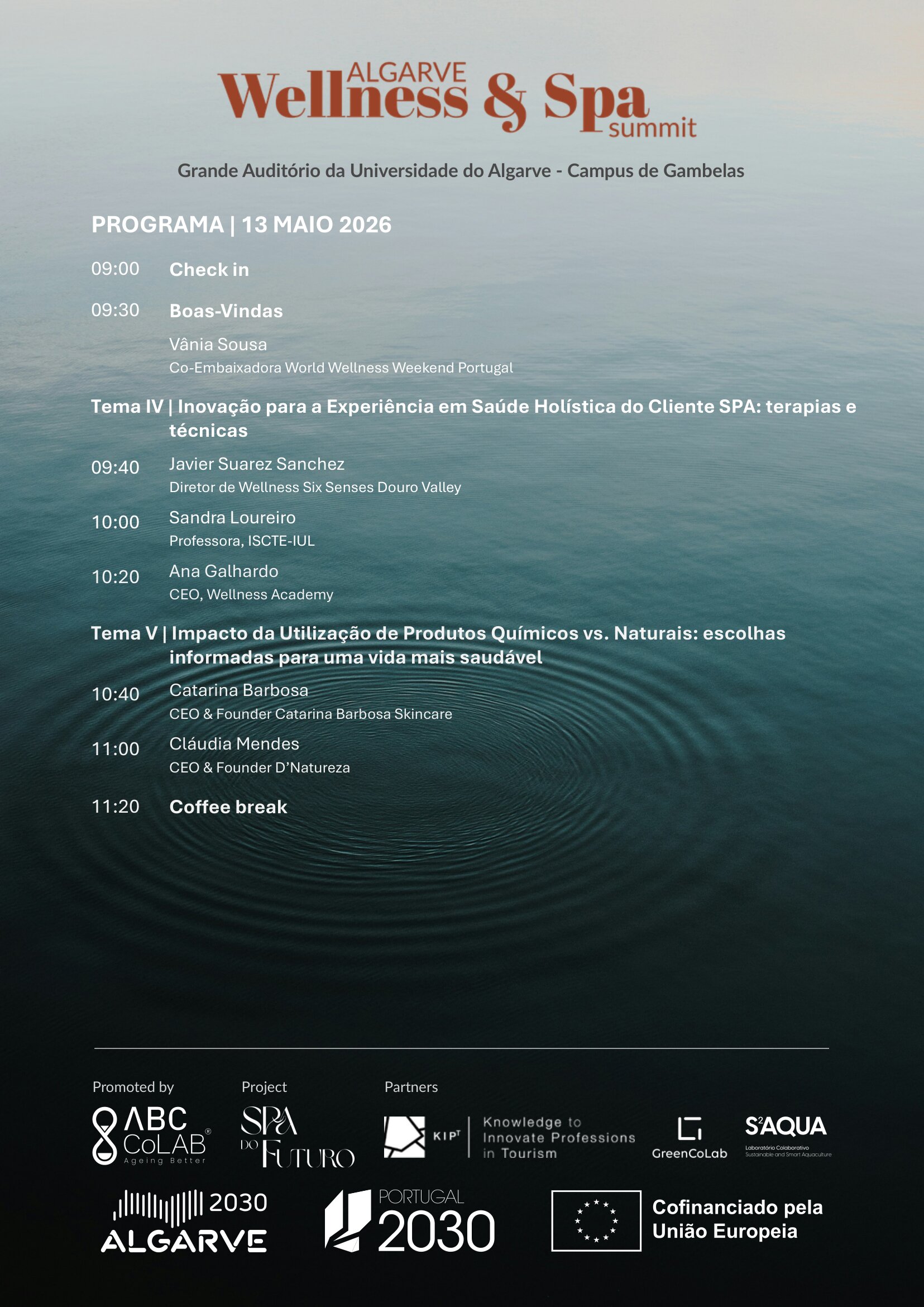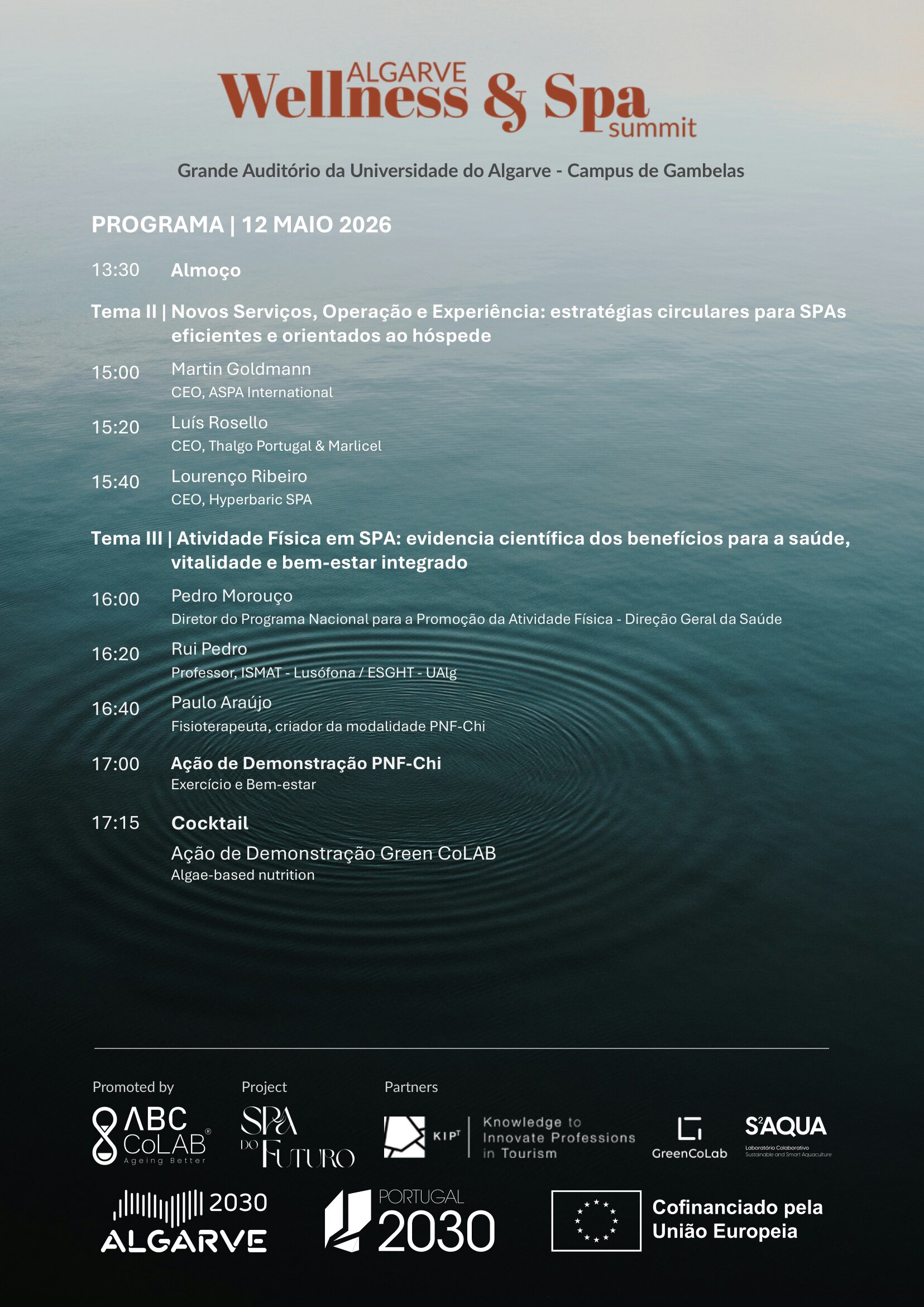 O Algarve Wellness & SPA Summit terá lugar nos dias 12 e 13 de maio, no Campus de Gambelas (Faro), e é promovido pelo ABC CoLAB – Ageing Better, no âmbito do projeto SPA do Futuro, cofinanciado pelo Programa Algarve 2030.