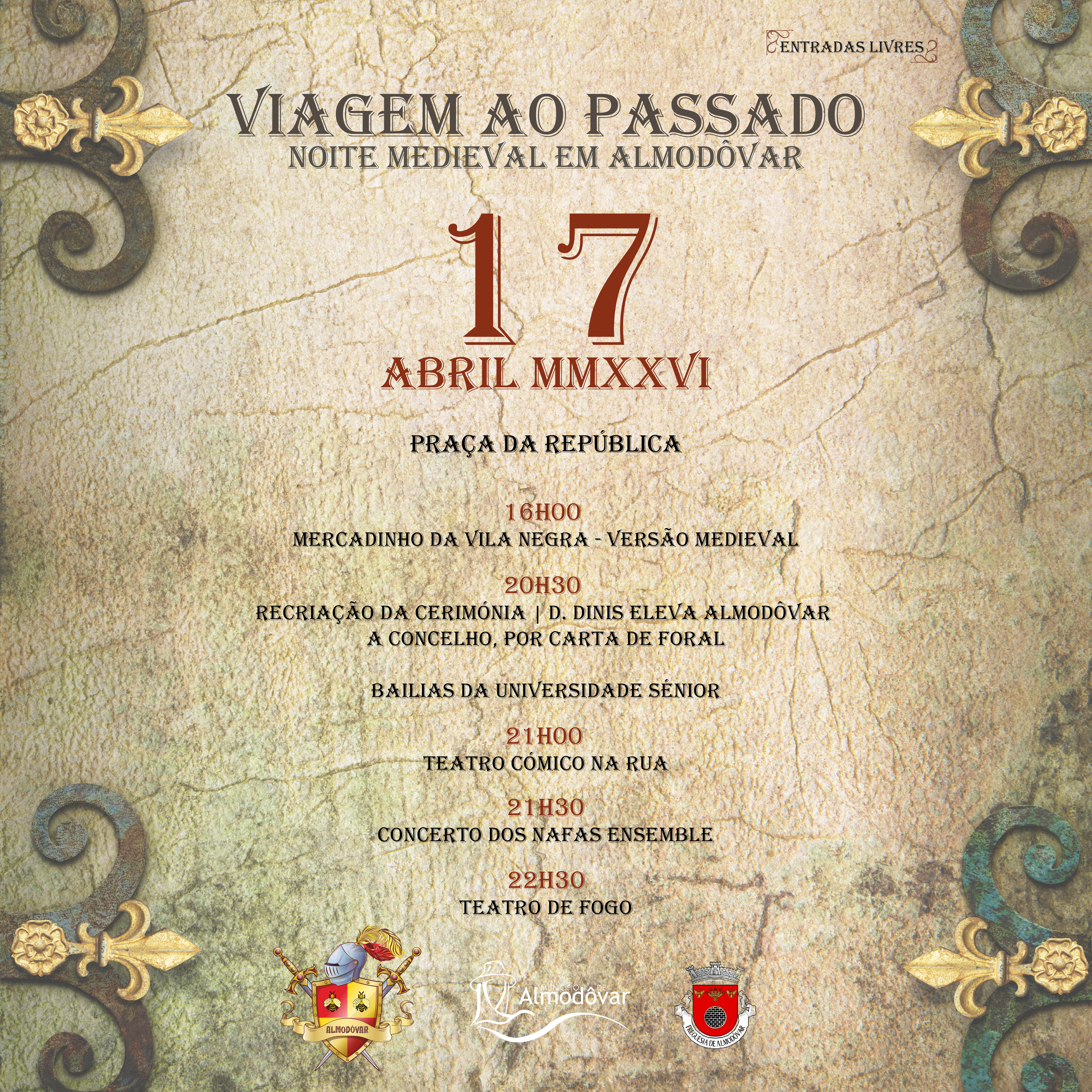 A iniciativa tem início às 16 horas, com a realização do “Mercadinho da Vila Negra” – Versão Medieval. Às 20h30, realiza-se uma recriação histórica da Cerimónia onde o Rei D. Dinis eleva Almodôvar a Concelho, por Carta de Foral.