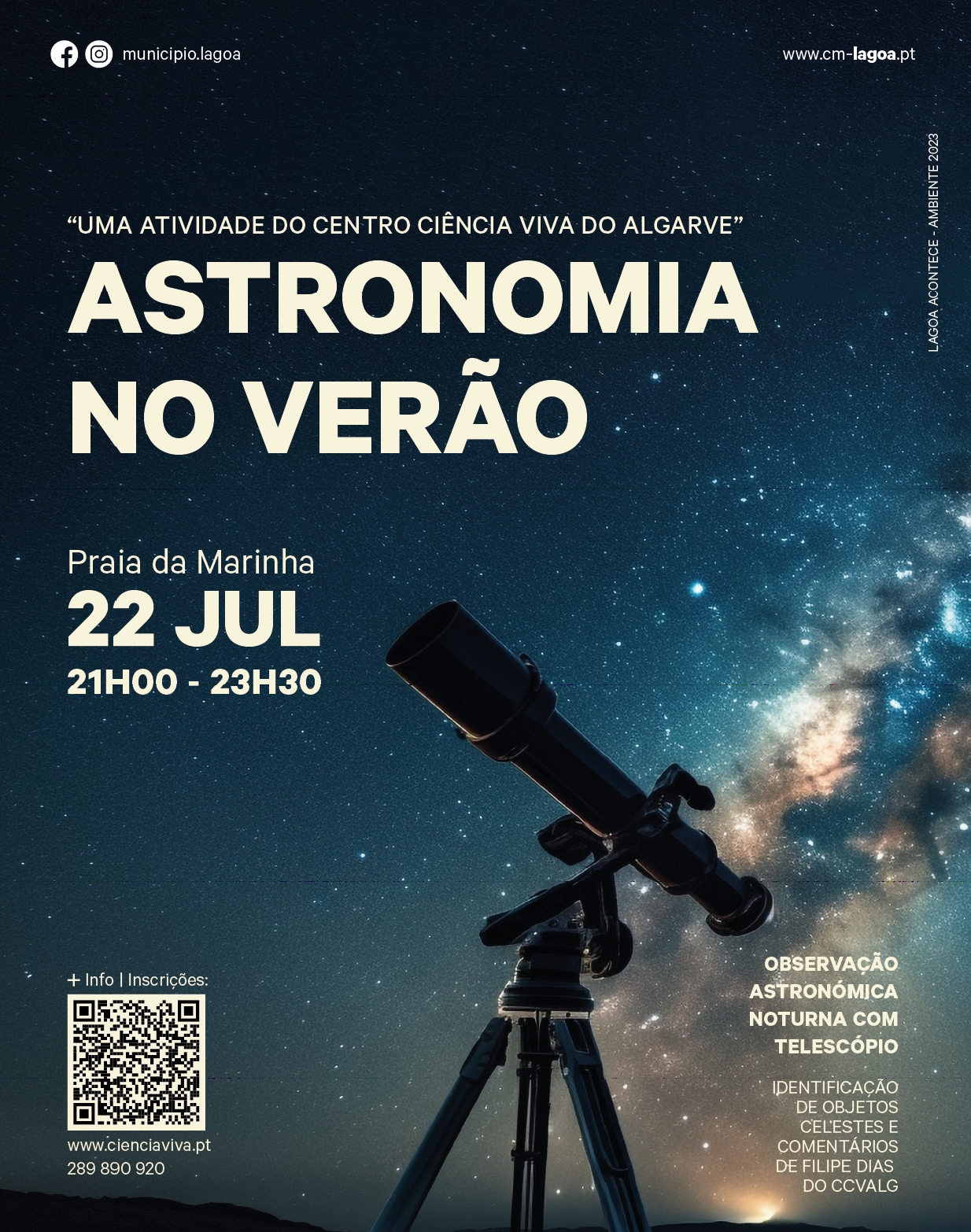 O Município de Lagoa, em colaboração com o Centro Ciência Viva do Algarve, volta a realizar a atividade “Astronomia no Verão”, observação astronómica noturna com telescópio, no próximo dia 22 de julho, entre as 21h00 e as 23h30, na Praia da Marinha, em Lagoa.