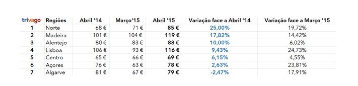 De acordo com o último estudo do motor de busca trivago, a subida de preços da hotelaria em relação ao período homólogo verifica-se um pouco por todo o país, à exceção do Algarve. Especial destaque para o Norte (+25,00%), seguido da Madeira (+17,82%), Alentejo (+10,00%) e Lisboa (+9,43%) que registam as maiores subidas. Os preços médios nacionais situam-se neste momento nos 96€ por quarto duplo, quando na vaga homóloga apenas atingiam os 89€.