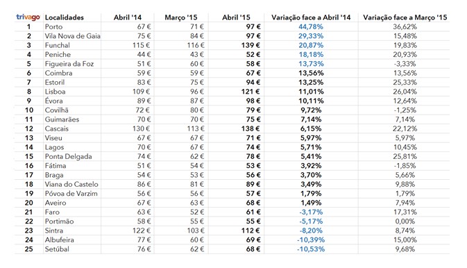 A nível nacional, Porto (+44,78%), Vila Nova de Gaia (+29,33%) e Funchal (+20,87%) são as localidades que apresentam as maiores subidas - todas acima dos 20%-, enquanto, no negativo se encontram Setúbal (-10,53%), Albufeira (-10,39%) e Sintra (-8,20%). Peniche (52€), Fátima (52€) e Portimão (55€) são agora as localidades mais baratas para pernoitar em Portugal, enquanto Funchal (139€), Cascais (138€) e Lisboa (121€) apresentam os preços mais elevados.