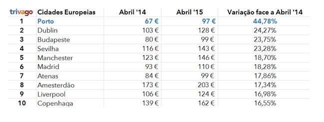 Depois de no último mês ter registado a quarta maior subida entre as principais cidades da Europa, o Porto é agora a cidade europeia que regista maior inflação do custo médio de estadia (+44,78%), a larga distância de Dublin (+24,27%), Budapeste (+23,75%) e Sevilha (+23,28%), que apresentam ainda assim crescimentos superiores a 20%. A capital portuguesa surge na 20.ª posição no top 50 europeu, com um crescimento de +11,01%. Dormir em Lisboa num quarto duplo custa em média 121€, enquanto no ano passado custava 109€. Em sentido oposto, São Petersburgo (-18,99%), Moscovo (17,60%) e Estocolmo (-8,48%) apresentam as maiores quedas.
