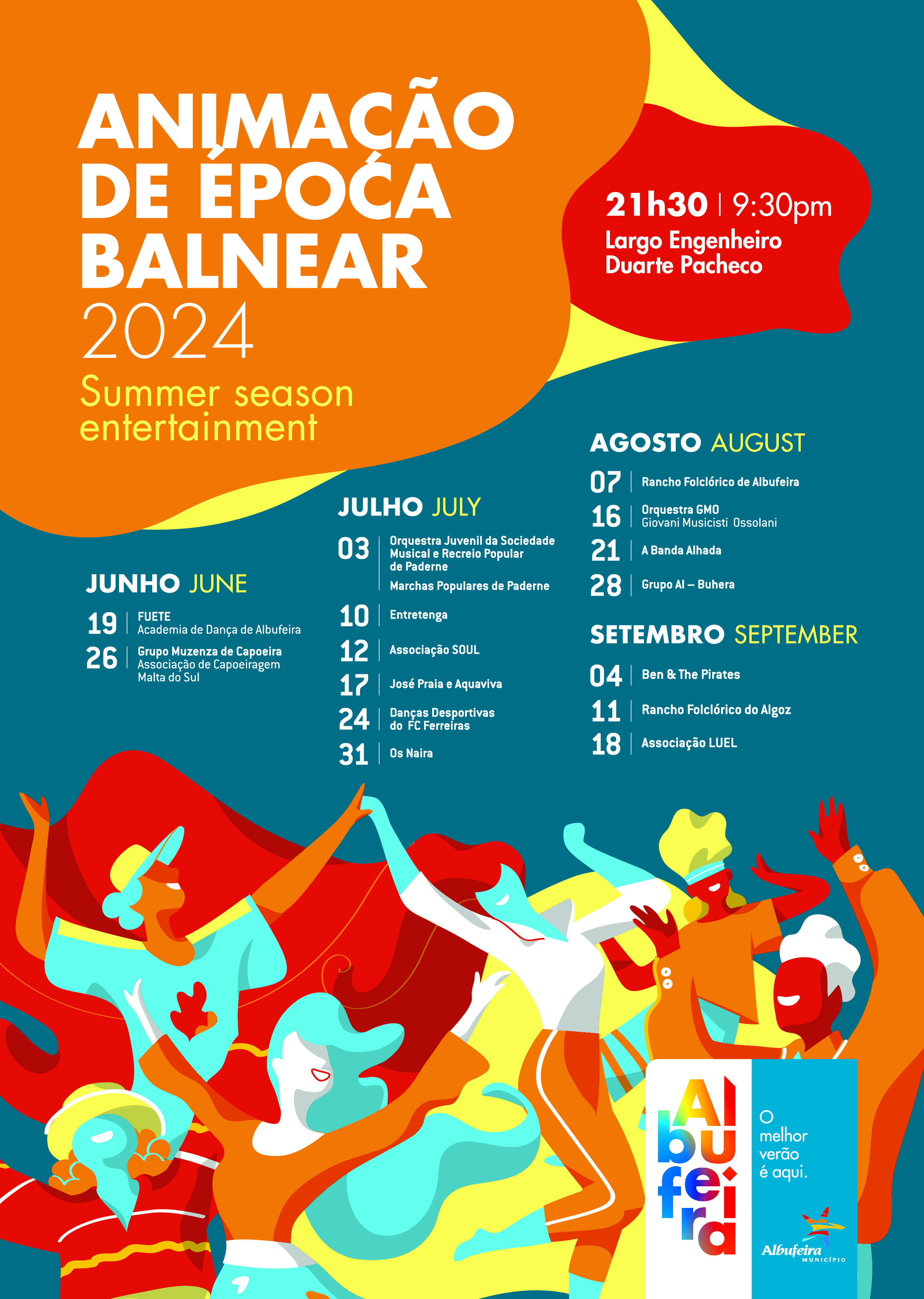 O programa deste ano da “Animação da Época Balnear” arranca a 19 de junho, com a atuação da FUETE – Academia de Dança de Albufeira e, na semana seguinte, dia 26, sobe ao palco a Associação de Capoeiragem Malta do Sul, fechando assim, a programação do mês de junho. O programa prossegue nos meses seguintes até setembro, sempre às quartas-feiras, com início às 21h30. Uma época muito especial para os artistas de Albufeira partilharem com o público as suas criações performativas.