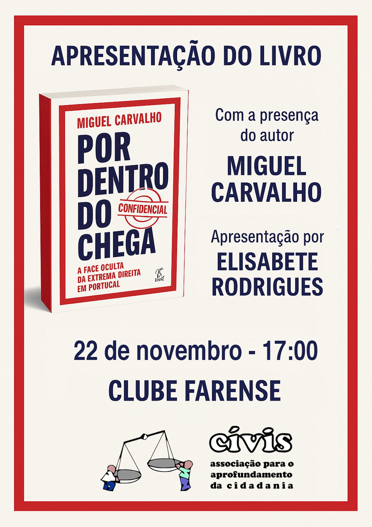 No próximo dia 22 de novembro, às 17:00, no Club Farense, a Cívis promove a apresentação do livro “Por dentro do Chega, a face oculta de extrema direita em Portugal” da autoria de Miguel Carvalho, (Objetiva, 2025).