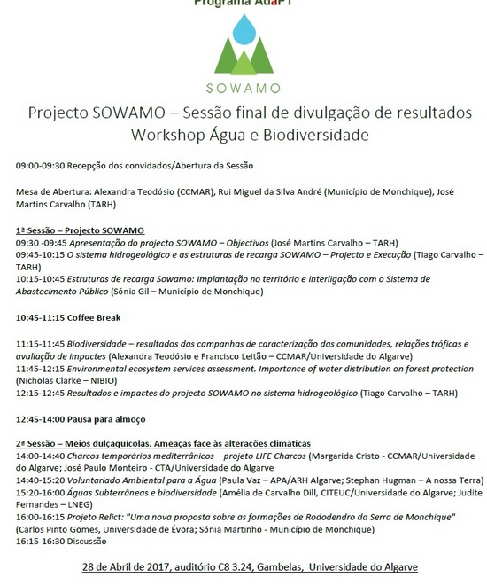 Decorre hoje o “Workshop” final do projeto SOWAMO (Água e Biodiversidade) no campus de Gambelas, Universidade do Algarve cujo Município de Monchique é parceiro ativo.