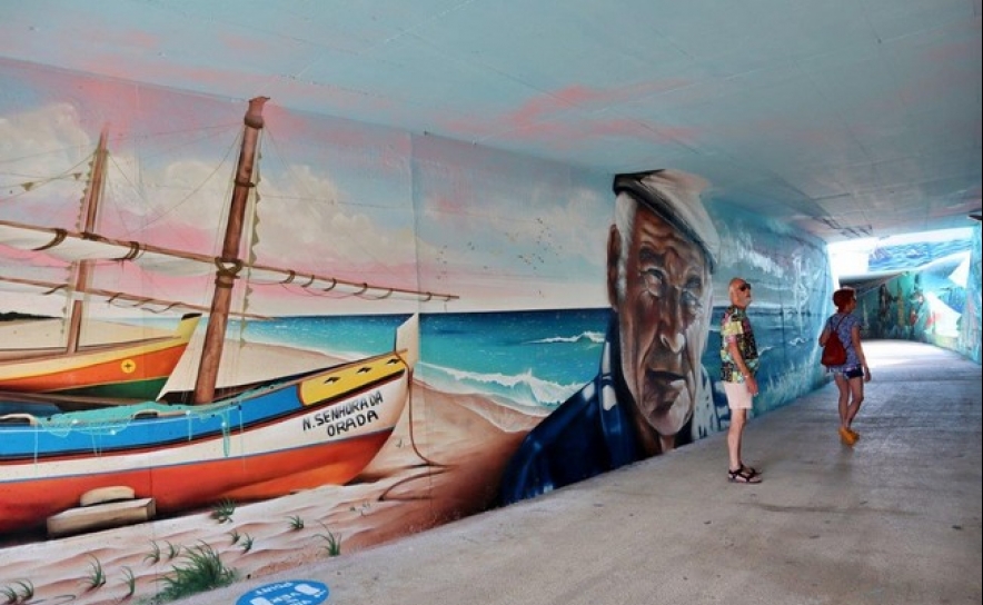 Quem passar pelo túnel pedonal da Rotunda dos Dois Mundos, na Avenida dos Descobrimentos, numa das entradas principais de Albufeira,