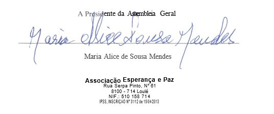 Que se realizará na sede da Associação Esperança e Paz, rua Serpa Pinto n.º 61 em Loulé, no próximo dia 8 de novembro de 2025, pelas 19:00 horas, com a seguinte ordem de trabalhos: