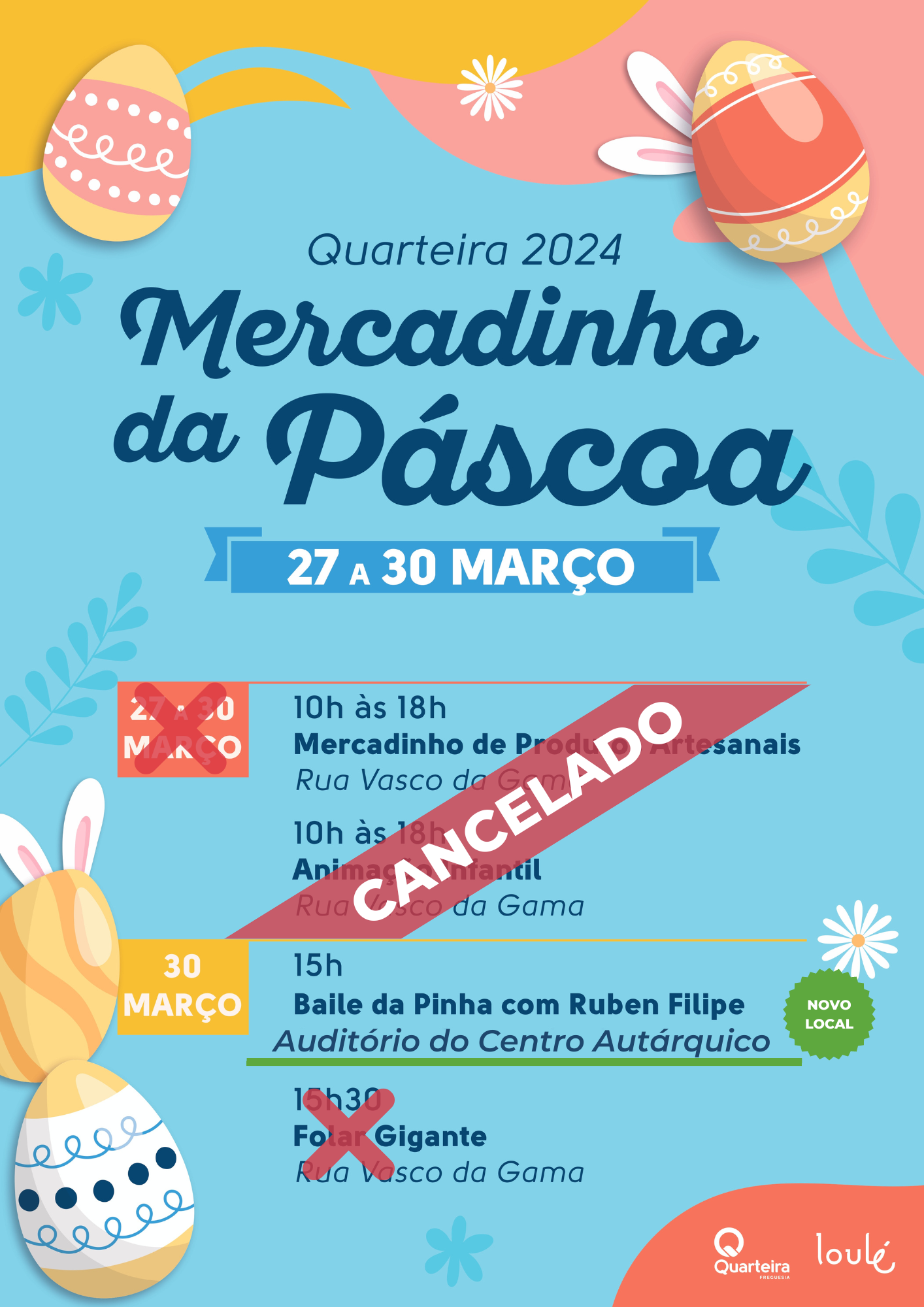 Após análise das previsões do estado do tempo, e tendo como prioridade a segurança de todos os envolvidos, o Executivo da Junta de Freguesia tomou a decisão de cancelar o Mercadinho de Produtos Artesanais, a Animação Infantil e Folar Gigante previstos para os dias 27 a 30 de março.