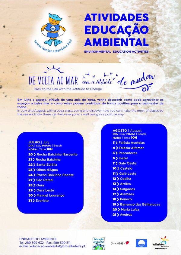 Durante os meses de julho e agosto, as 26 praias galardoadas com a Bandeira Azul do município de Albufeira acolhem aulas gratuitas de Yoga, assim como informação e sensibilização ambiental. Trata-se de uma das ações do programa de Educação Ambiental do município, no sentido de proporcionar bem-estar e atividades físicas aos veraneantes, zelando pela segurança de todos os presentes e pelo seu conforto.