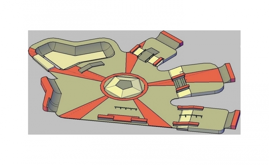 Instalado num terreno de 18000m2, o projeto prevê a criação de um skate parque semicircular com três plataformas de saída radiais que se encaixam nos taludes existentes e uma “bowl”. As plataformas de saída afastam-se entre si, permitindo a introdução de zonas ajardinadas e arborização pelo interior da plataforma do skate parque.